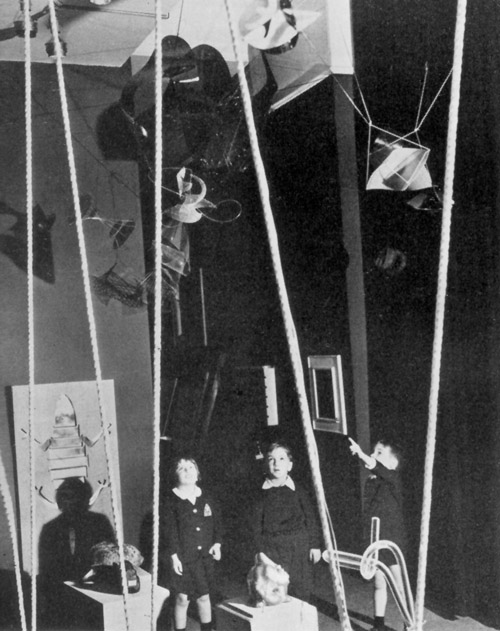 Young artist Gene Gold (at right) is seen pointing up toward a mobile hanging from the ceiling -- a part of The Children's Art Carnival at the Museum of Modern Art. In 1942 Victor d.Amico, MoMA.s Director of Art Education developed this program which consisted of a gallery of toys, props and art supplies. Gold.s artist/dancer mother organized artists to teach there, helped European artists settle in the U.S. and find work at MoMA, was a member of the Museum during wartime, and was a friend of Soichi Sunami, whose photographs, used with permission, portray this innovative children.s art program which flourished at the Museum of Modern Art until 1949.